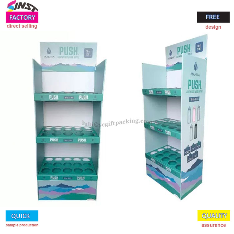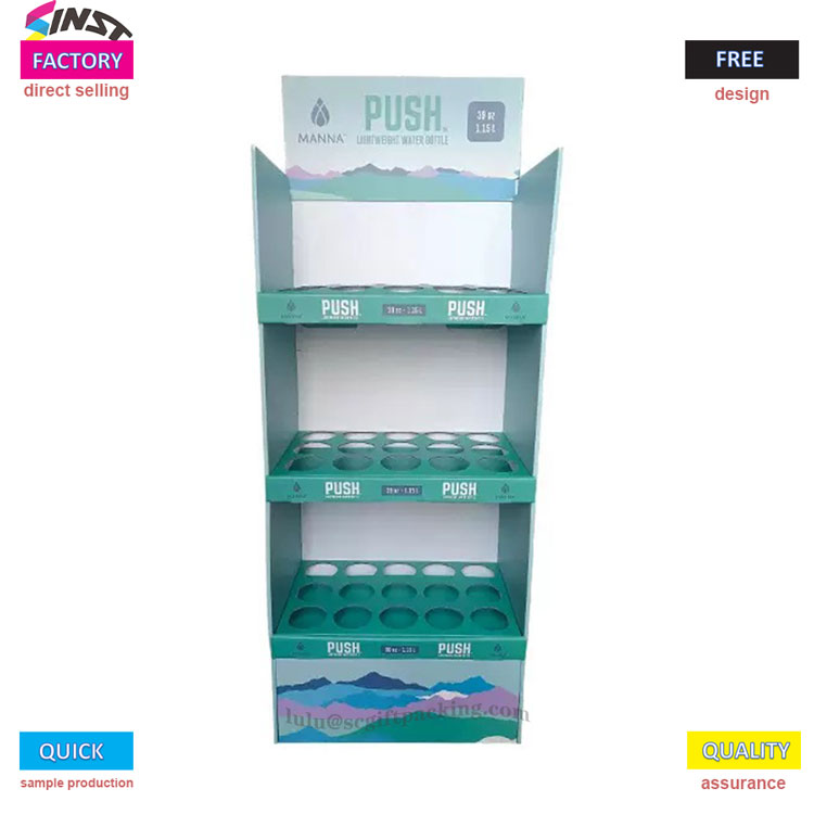 Questo display del pavimento in cartone di cartone per la bottiglia d'acqua Supermarke presenta un design della struttura a griglia a tre strati, con scanalature circolari su ogni strato per tenere con precisione la bottiglia d'acqua e impedire il rotolamento. Il logo del marchio può essere stampato in alto e la grafica del prodotto può essere stampata sul lato, semplice e di fascia alta. Utilizzato principalmente per la visualizzazione di prodotti come bottiglie d'acqua, tazze, tazze da tè al latte, tazze di thermos, ecc.