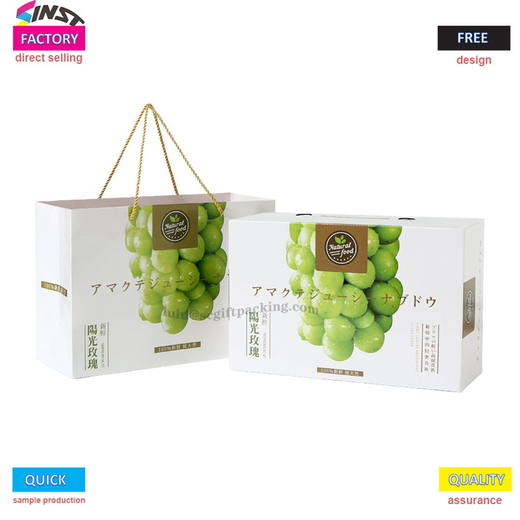 La scatola regalo portatile universale di frutta per l'uva è realizzata in materiale di cartone rinforzato e-corrugato a e-corrugato, con un motivo di uva brillante stampato sulla superficie. È abbinato a una cinghia di trasporto verde in alto e il logo del marchio stampato sul corpo della scatola, trasmettendo chiaramente la nostra filosofia di servizio di base - non è necessario che gli intermediari possano fare differenze di prezzo e l'intero processo dalla selezione alla produzione di massa è gestito dalla fabbrica.