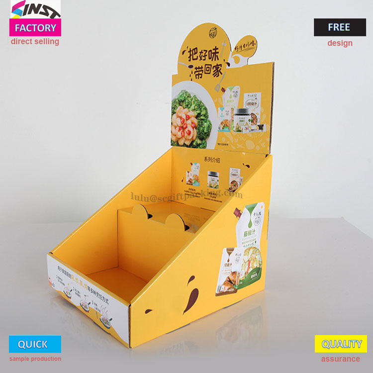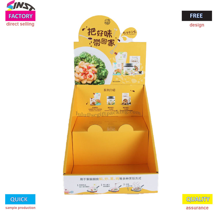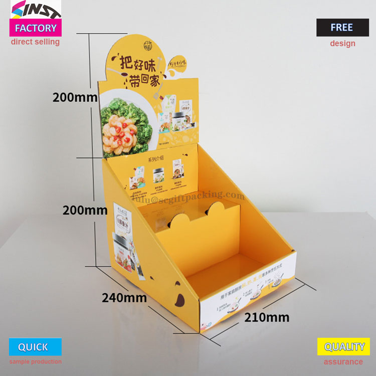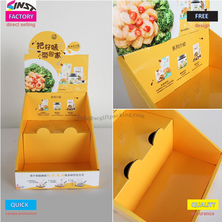 Questa è una scatola di display di cartone da bancone con stagionatura del supermercato, che può essere una scatola di display al pepe, scatola di display di sale, scatola di visualizzazione dell'essenza di pollo, ecc. È principalmente di colore giallo brillante ed è diventato uno strumento accattivante per il display per banco!